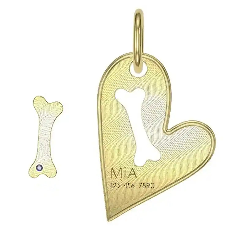 Introducing the Heart and Bone Whisker Link, a custom tag that embodies the unbreakable connection between you and your furry companion. Handcrafted with meticulous detailing, this tag showcases a heart with a cut out bone, which can also be worn as a charm on a necklace or bracelet - a truly heartfelt gift. Personalize your tag with a colorful gemstone and engrave special messages or cute paw prints. This gorgeous design truly captures the essence of pet ownership, making it the must-have accessory for pet lovers who treasure their irreplaceable bond with their beloved furry children!