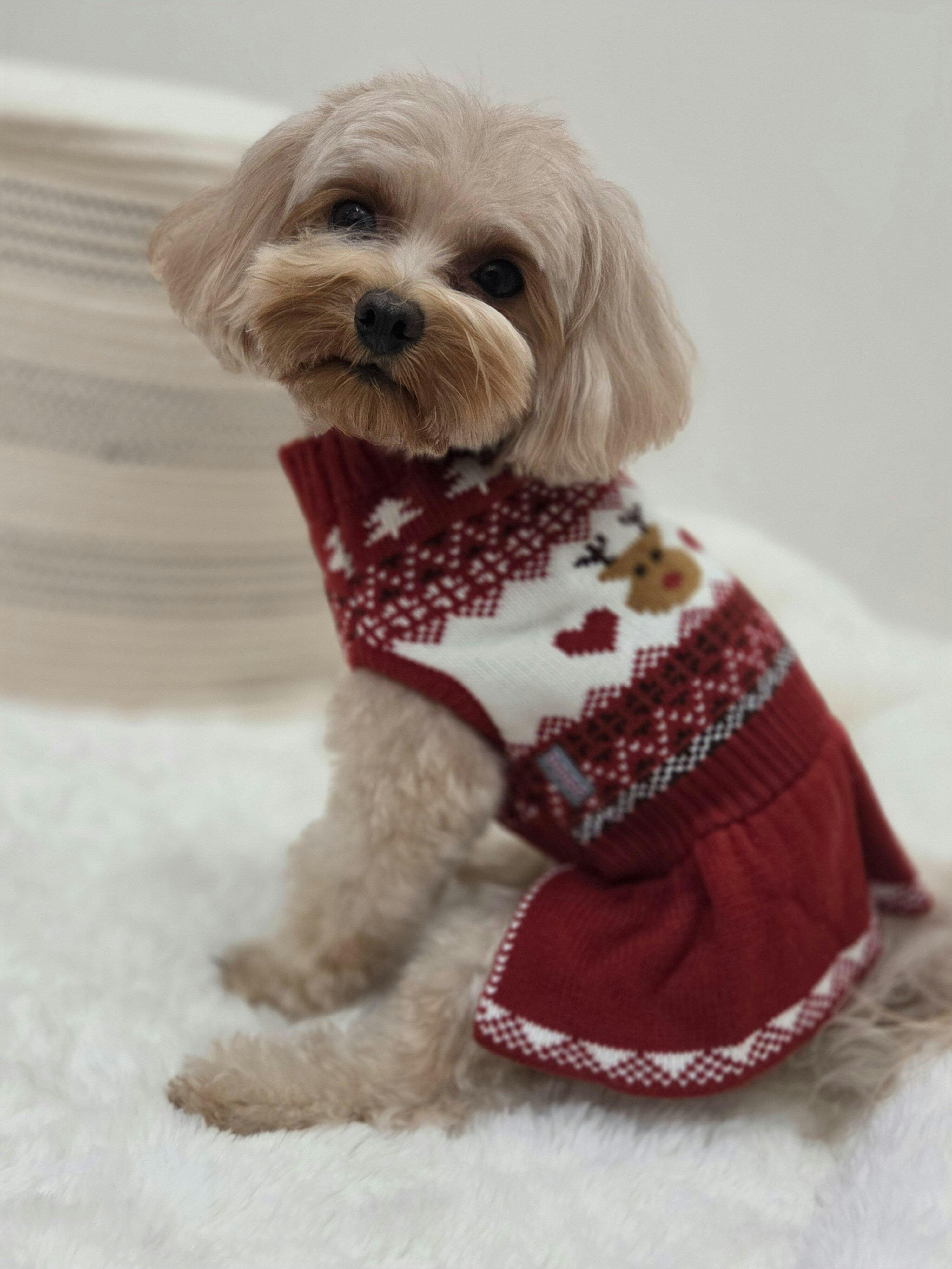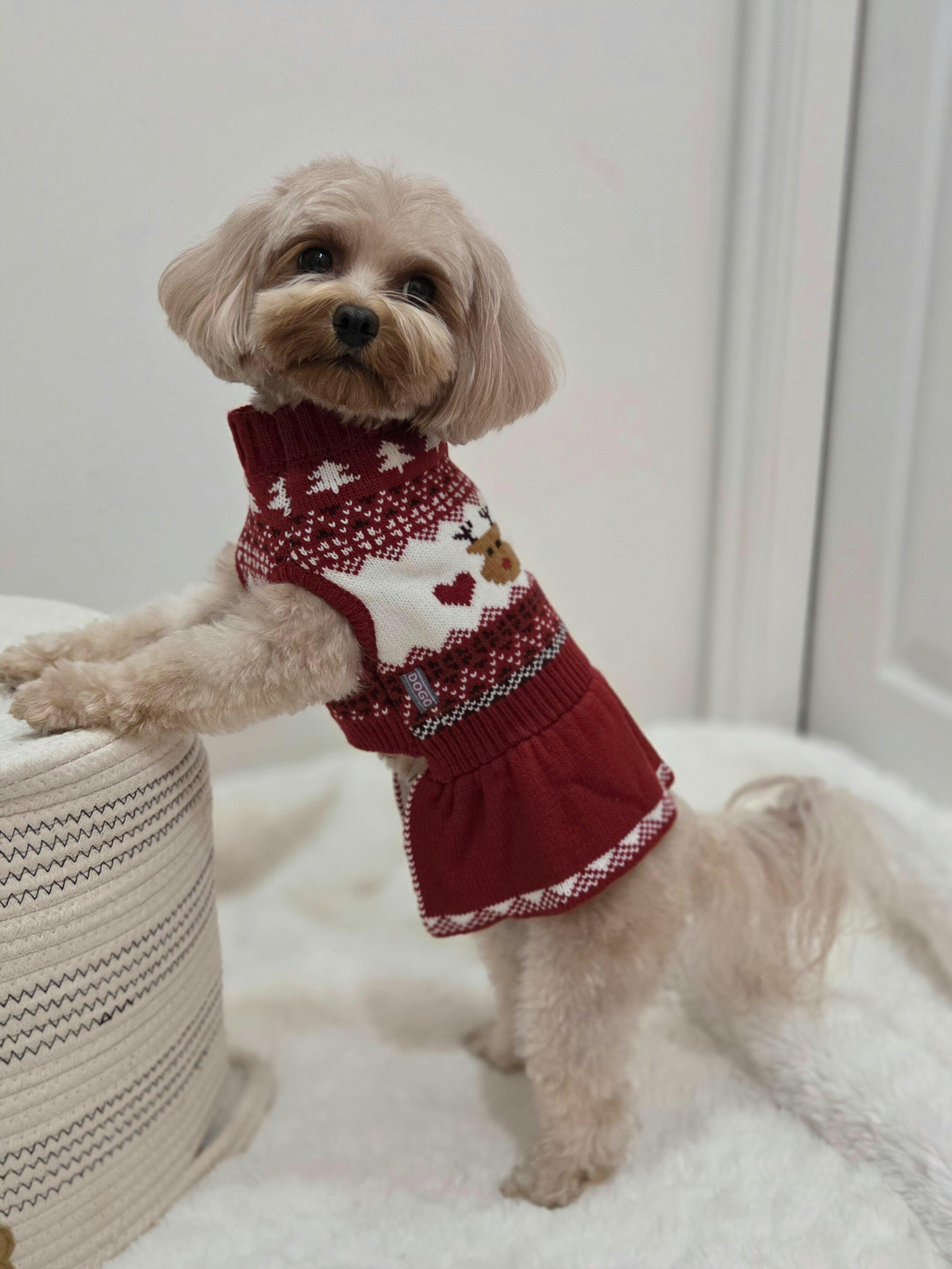 Brighten up your fur baby's wardrobe this season with the Reindeer Fair Isle Dog Sweater Dress! This adorable dress combines reindeer, snowflakes, and trees for a charming look. Plus, it even has a leash/harness hole for practicality. Keep your pup snug and chic with this essential sweater.